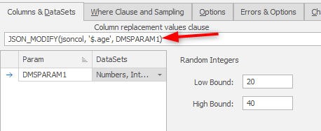 DMSPARAM1value.JSON_MODIFY(jsoncol, '$.age', DMSPARAM1);Use a dataset of your choice for the parameter. In the example below, we will use the Numbers, Integer, Random, As Text dataset.