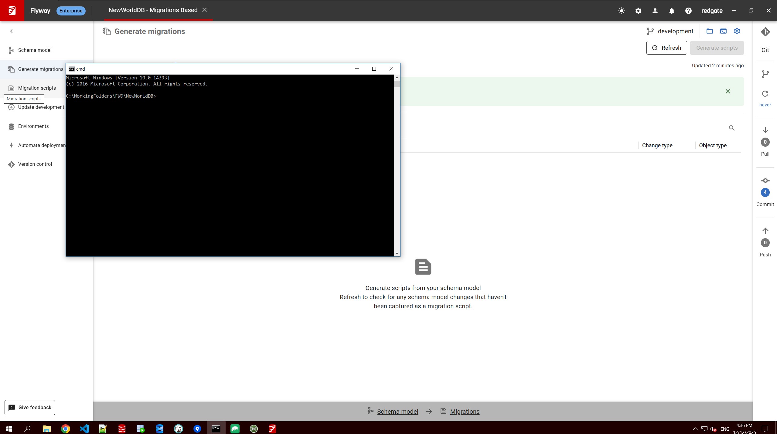 - In your project, go ahead and make some changes to your "development" database. This is the database you make changes to and flyway extracts changes from, in order to generate the migration script for you.