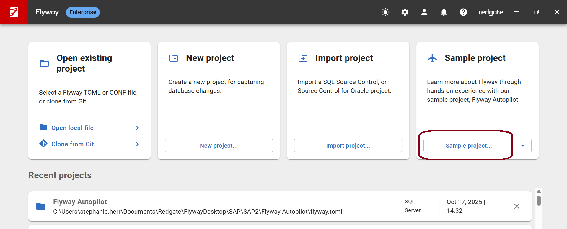 - Try out Flyway with our Flyway Autopilot Sample Project. You can access a guided tour through the Flyway Autopilot sample project in Flyway Desktop: