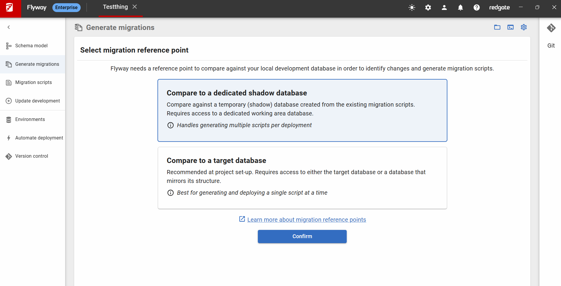 If you do not yet have a Shadow Database configured when going to the “Generate Migrations” page you will see the following choices: