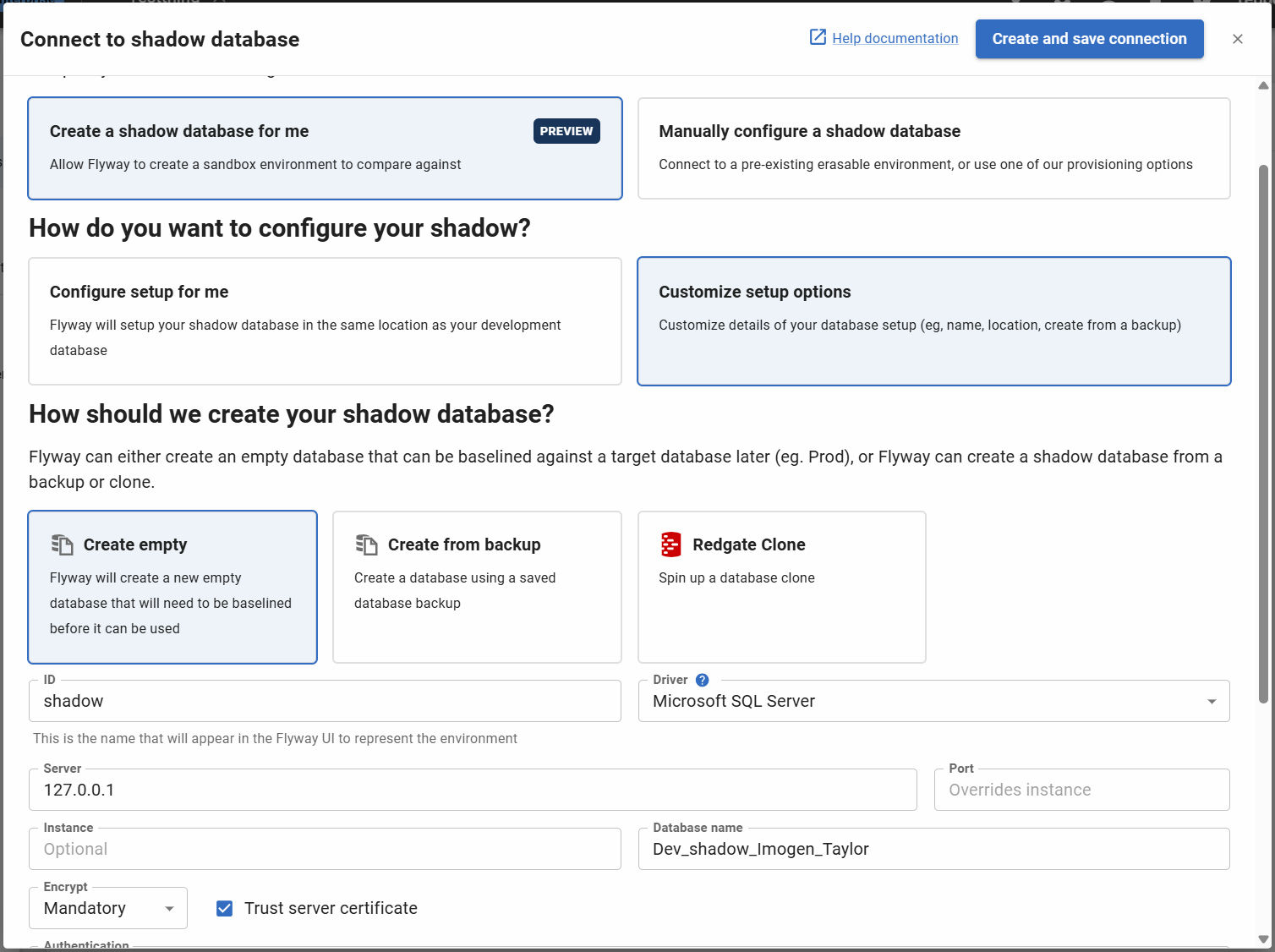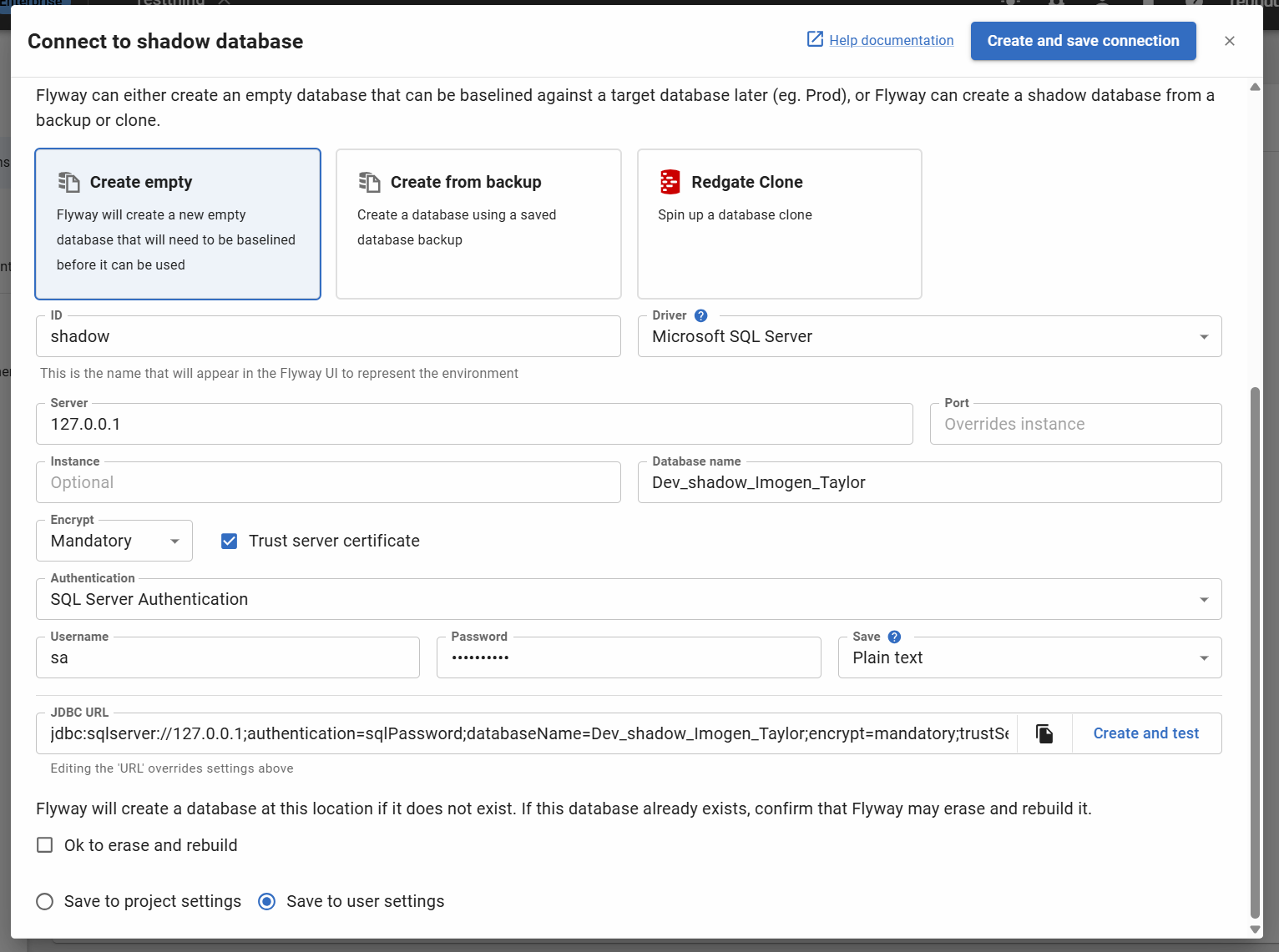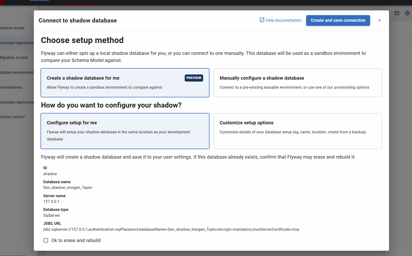 If a database with the same name exists already, clicking 'Create and save connection' may result in Flyway erasing the data in your database and rebuilding it. If you want to connect an existing database, use the 'Manually configure a shadow database' option