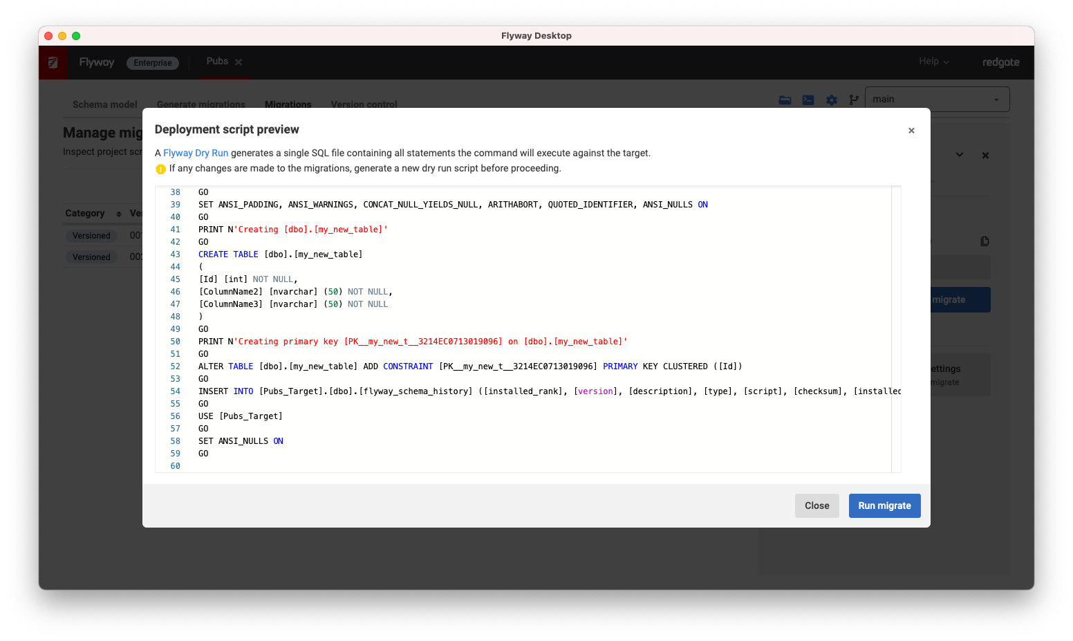 - Click View Dry Run script to see the exact deployment script, which concatenates all the pending scripts together, for that target database.