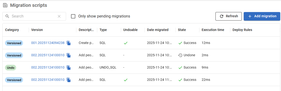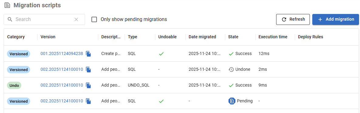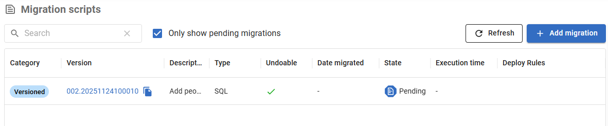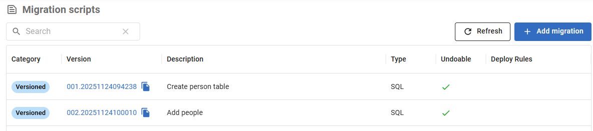 Viewing your scripts on the migrations scripts page, you should see something like the following: