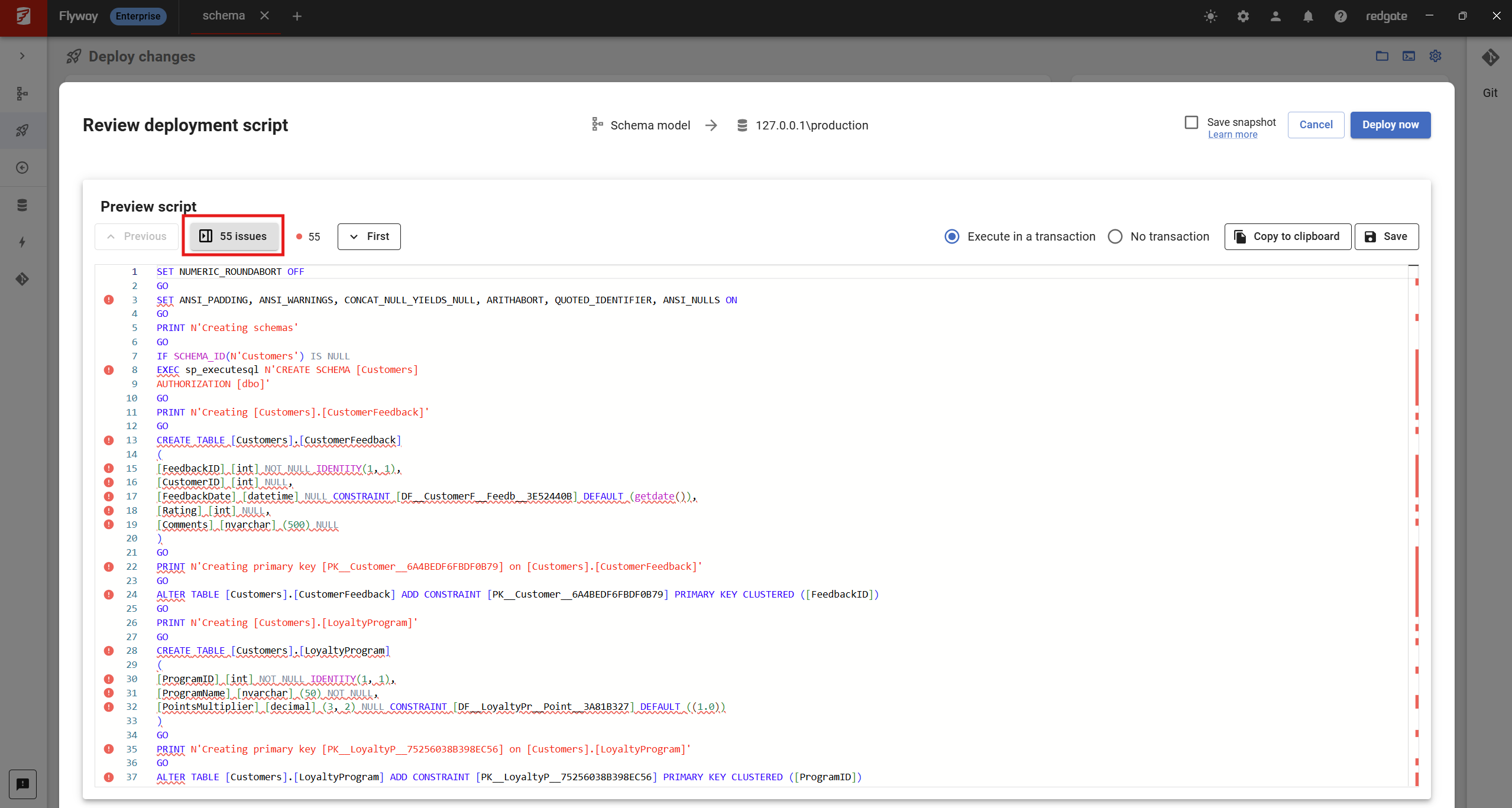 This defaults to adding a D__deployment.sql file into a deployments folder in your current directory. - Run flyway check -code to run static code analysis checks against the generated deployment script: