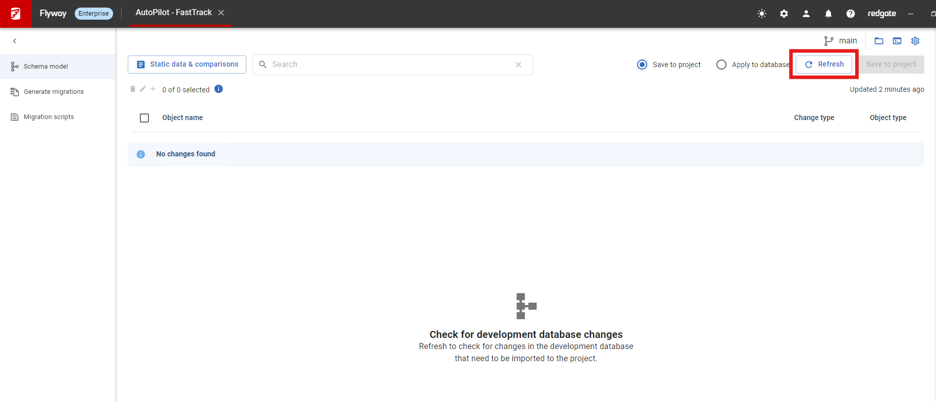 Once the databases are created, it’s crucial to synchronize Flyway Desktop with the current state of your AutoPilotDev database. This ensures that all objects in the database that haven’t yet been saved to the schema model are identified and ready for version control.