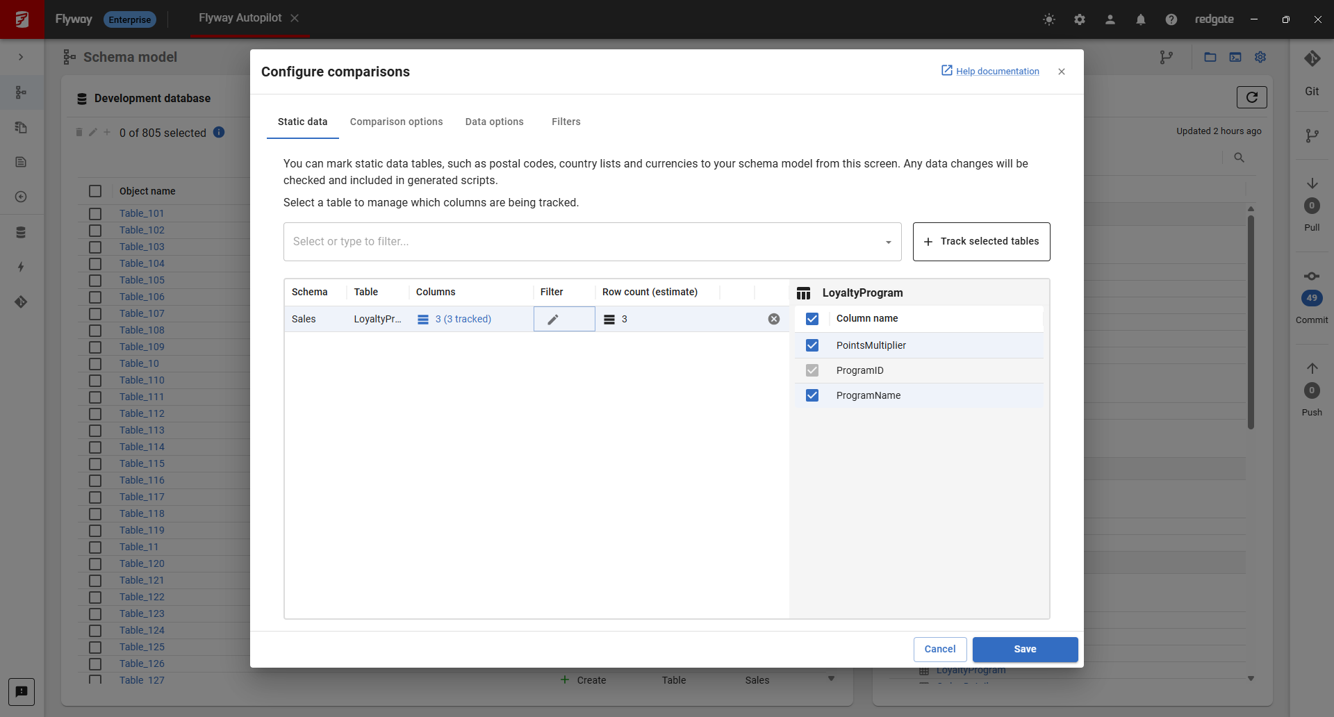On the Schema model page, click Static data & comparisons to configure the relevant tables that contain static data.  Once selected, these data changes will show up alongside schema differences.