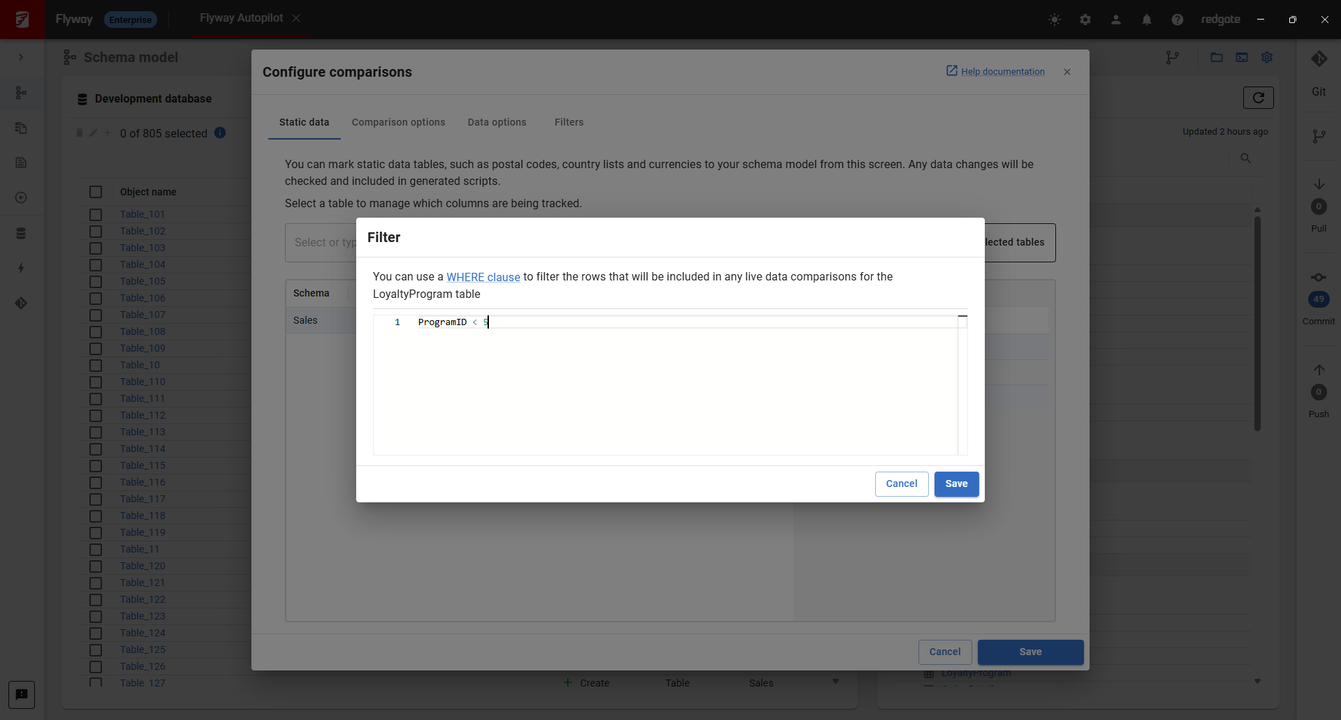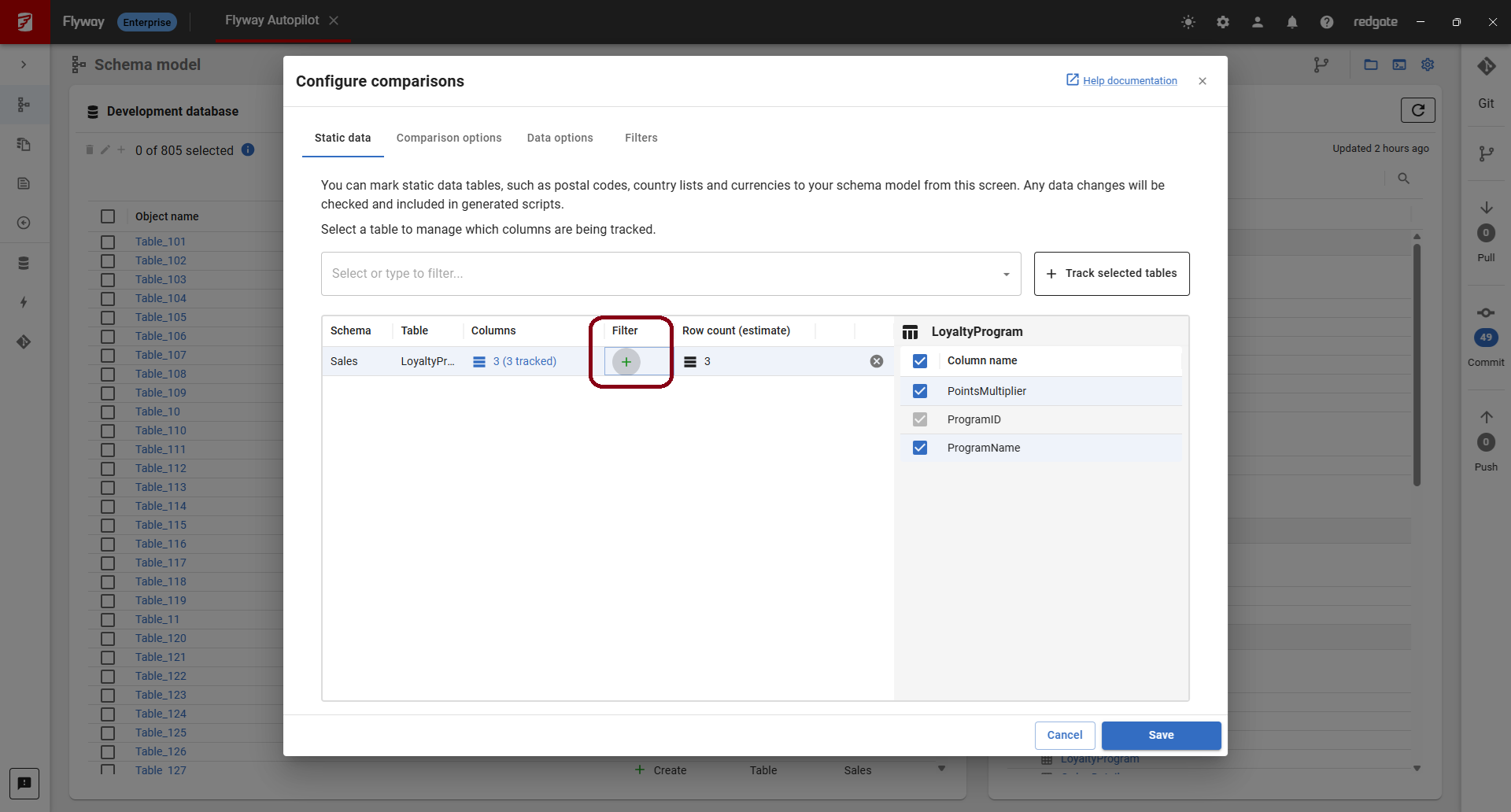On the Schema model page, click Static data & comparisons to configure the relevant tables that contain static data. Once selected, these data changes will show up alongside schema differences.