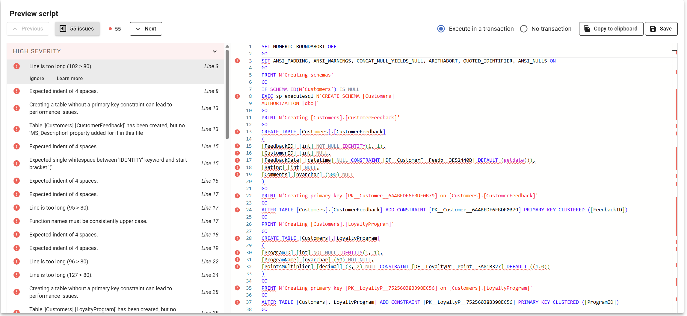 This defaults to adding a D__deployment.sql file into a deployments folder in your current directory. - Run flyway check -code to run static code analysis checks against the generated deployment script: