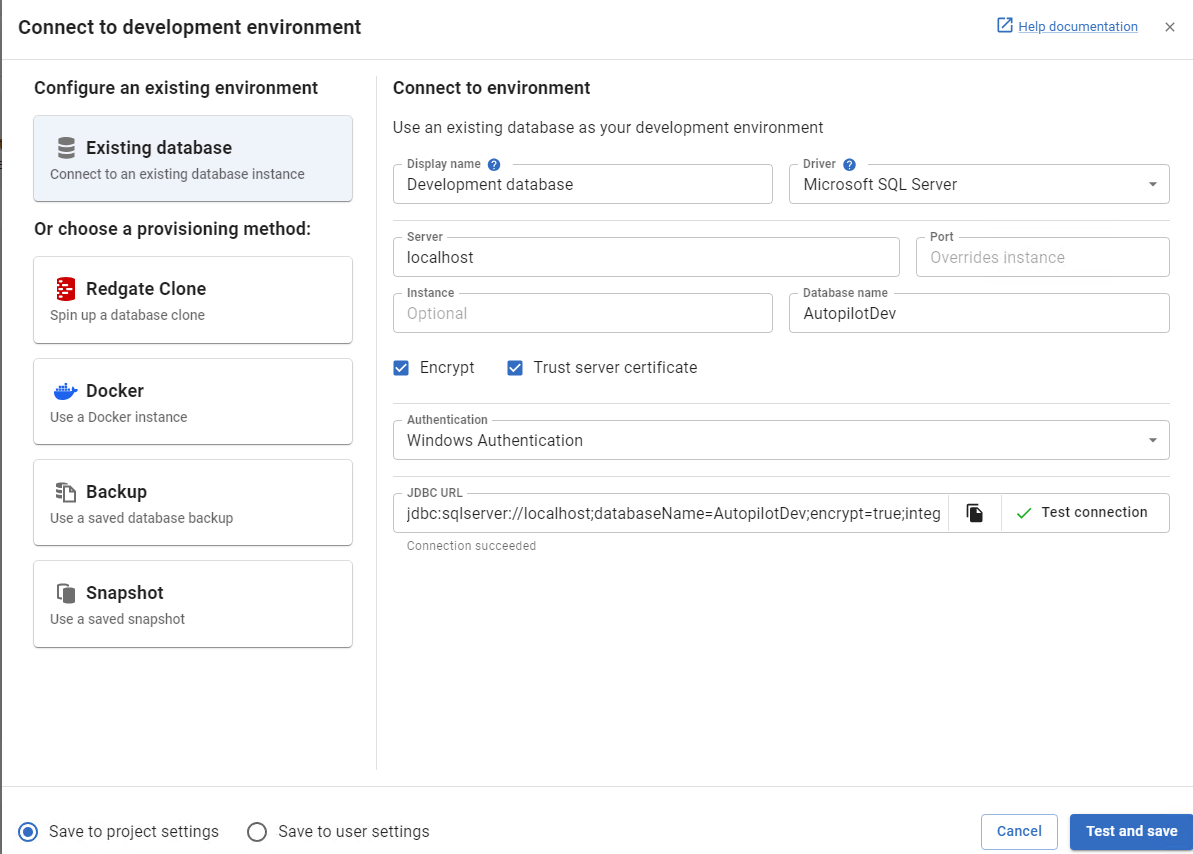 database (or whatever you’ve chosen to name your dev environment). Then click Test and Save to validate and save your changes.