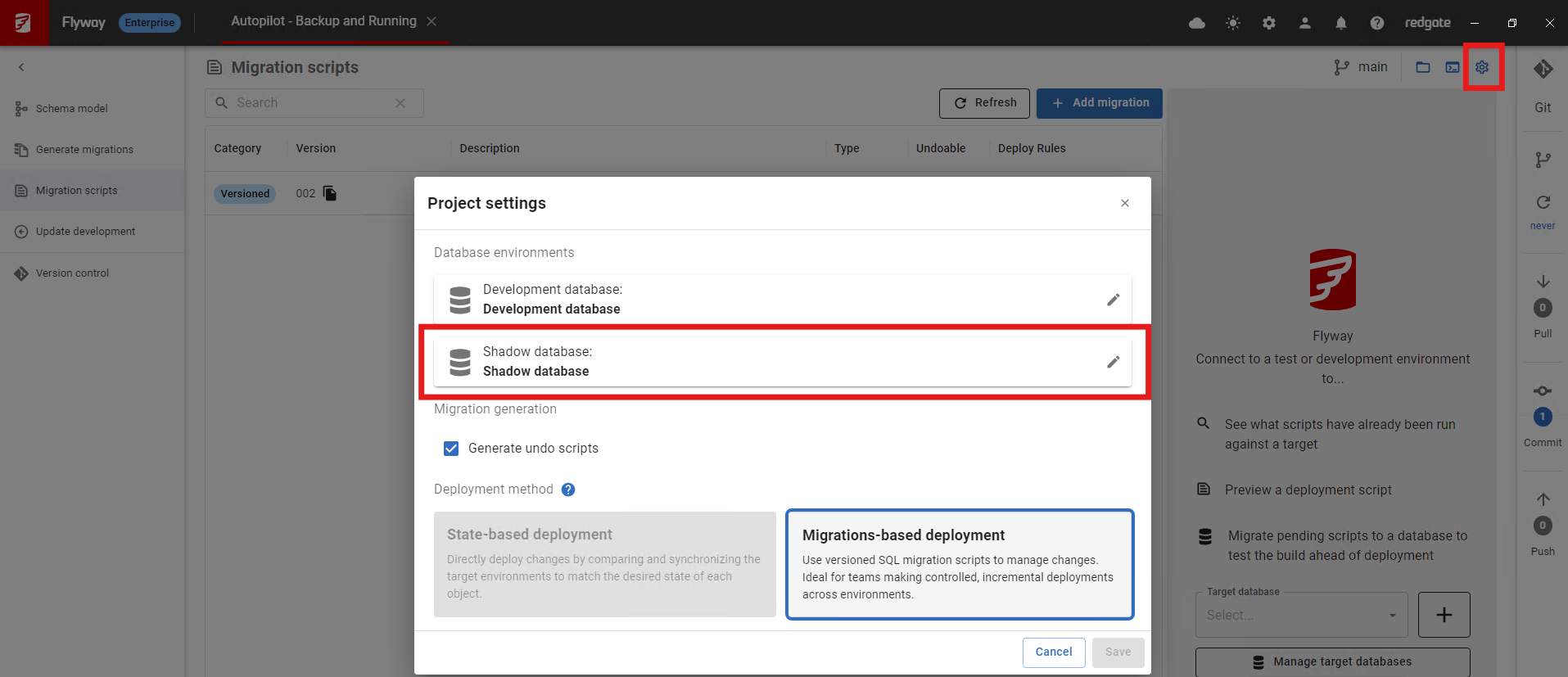 In Flyway Desktop, click the blue cogwheel ⚙️ in the top-right corner of the screen.