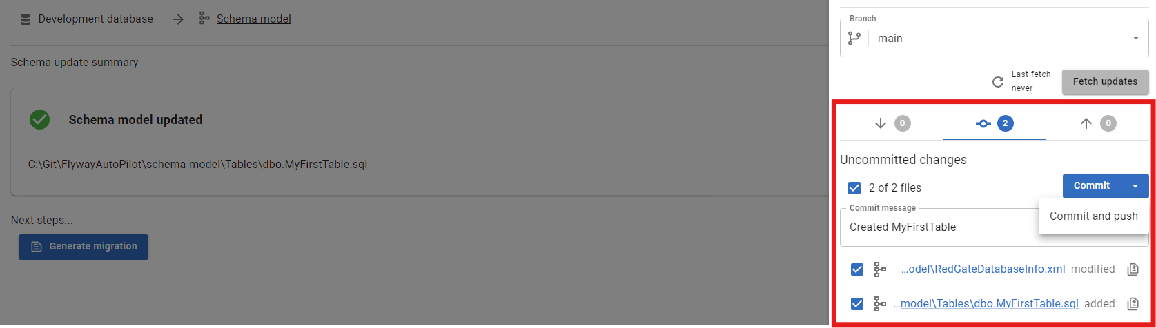 flyway.tomlproject settings file if you updated connection details. - Select all the changes, enter a commit message, and click Commit and Push (or Commit and then Push Changes as two separate actions if needed).