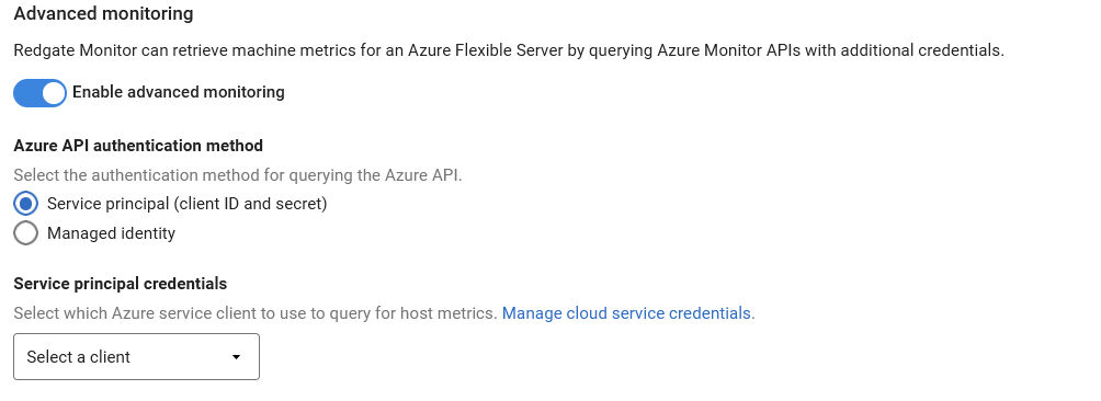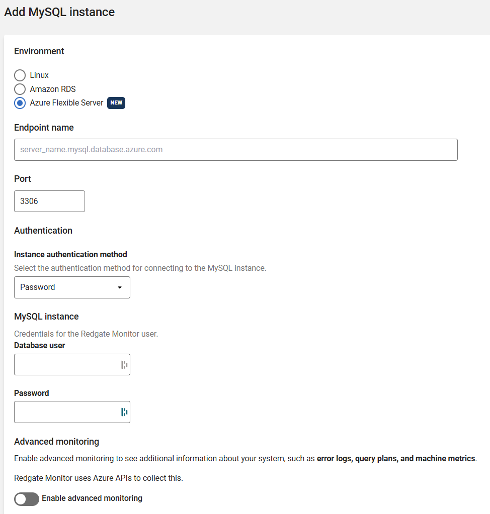 This page explains how to add an Azure Flexible Server for MySQL instance to Redgate Monitor. To monitor Azure Flexible metrics via the Azure API see enabling advanced monitoring for Azure Flexible server.