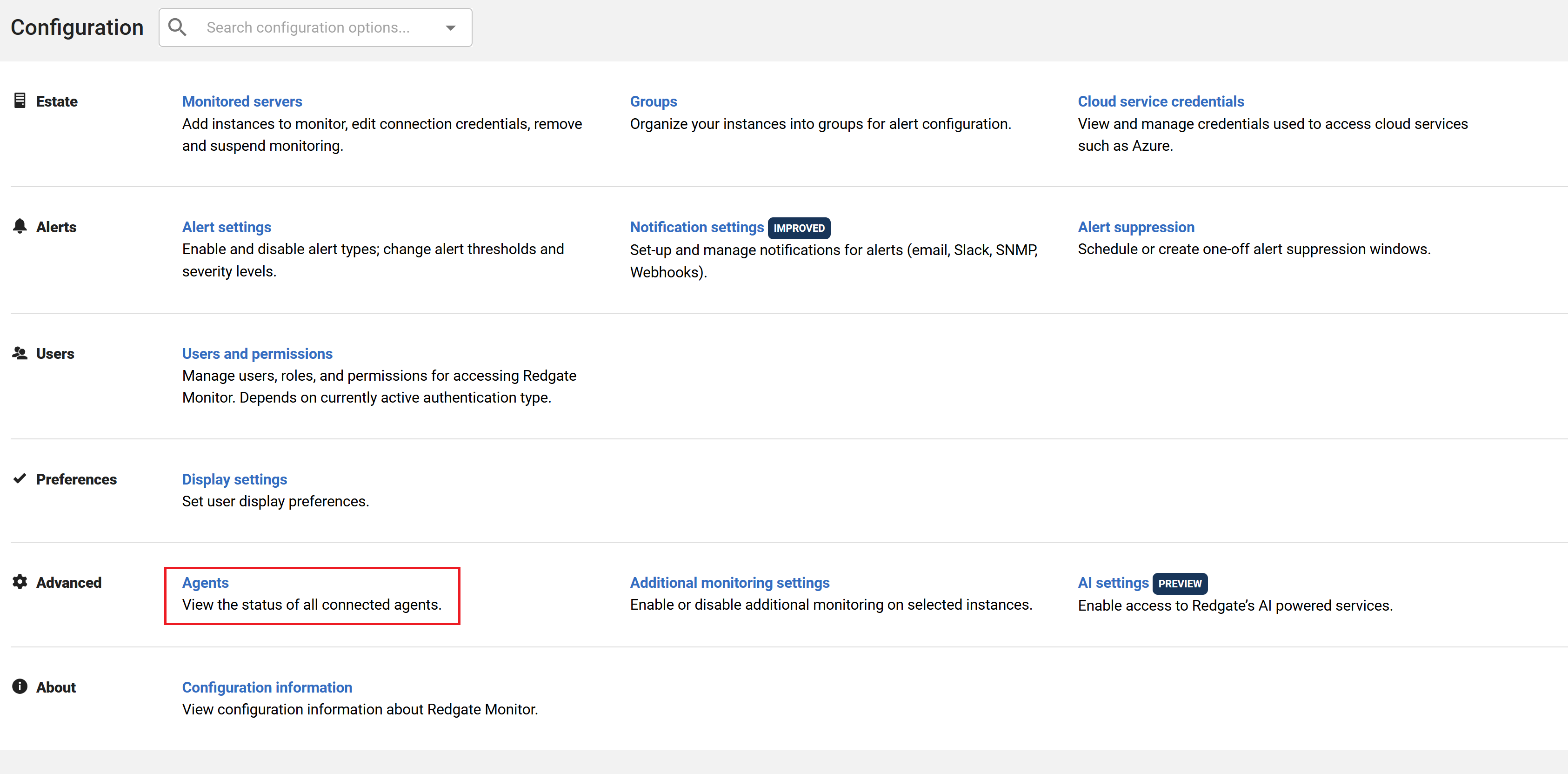 You can access the Agents section in the Configuration section of Redgate Monitor, as shown below: