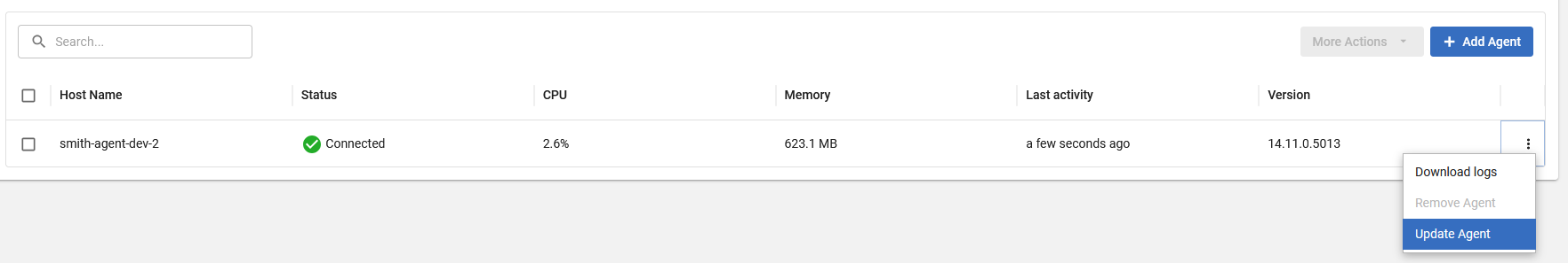 From this page you can see your agents, whether or not they are connected, some basic machine metrics, when they were last active and their version. You can also use the Add Agent modal to download an agent installer and get a command line including a one-time token to install an agent and establish a secure connection to the platform.
