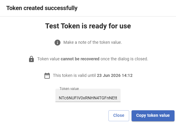 - Click Create. A new token will be generated and a dialog will display the token itself.