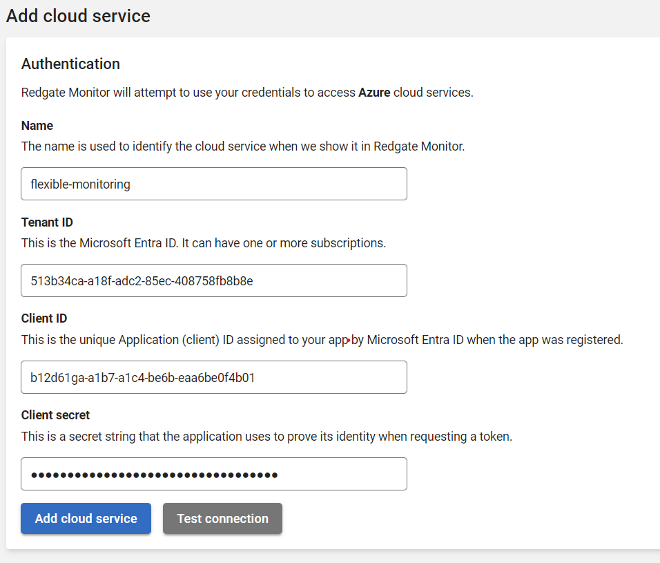 The credentials need to be set up in two parts. Firstly creating and assigning them in Azure and secondly entering them in to Redgate Monitor.