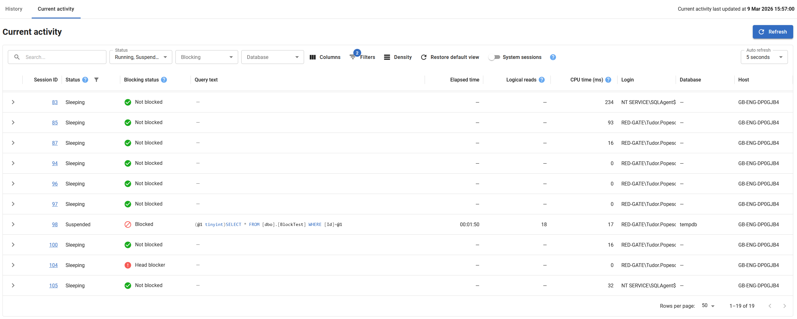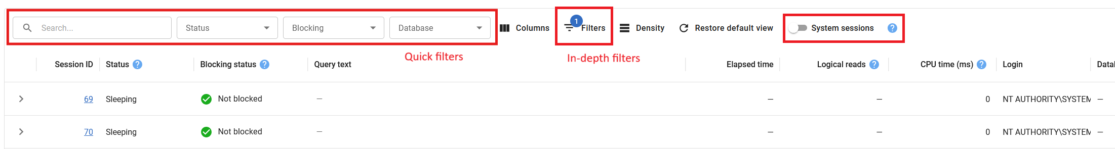 - Use quick dropdowns to filter by status, blocking, or database.