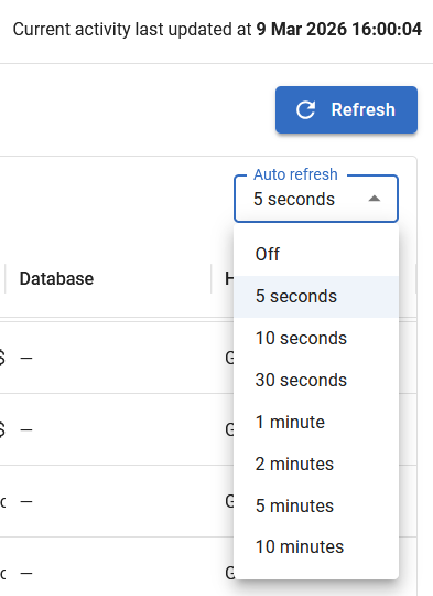 - Auto refresh. By using the Auto refresh dropdown, you can change the refresh interval or disable it.