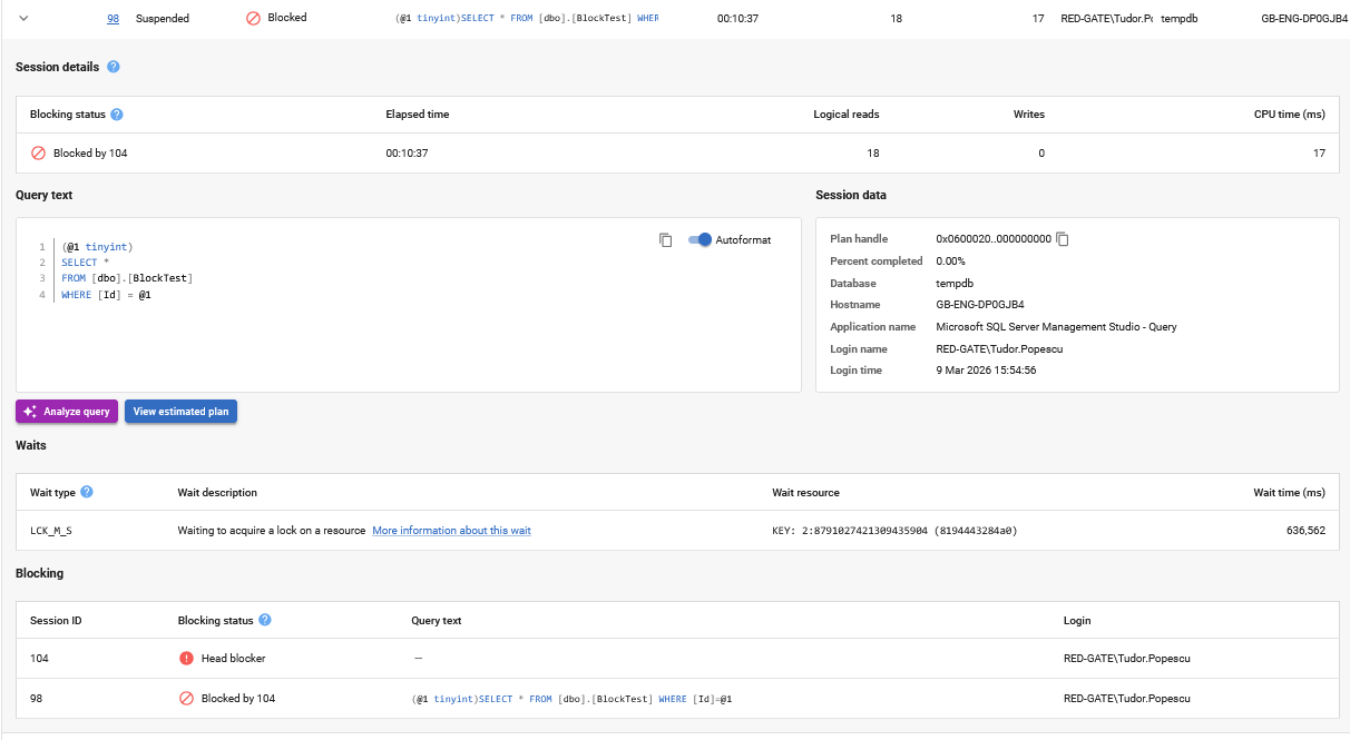 On the main table you can identify the head blocker immediately with the blocking status column and expand the row to see the full blocking tree in the blocking section.