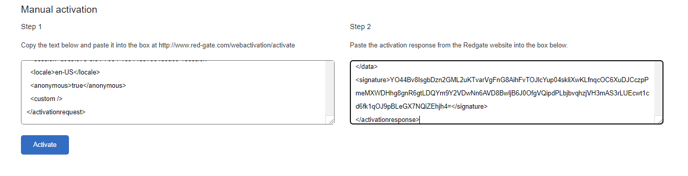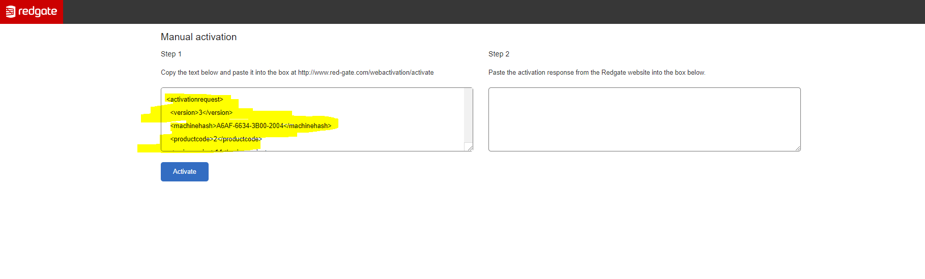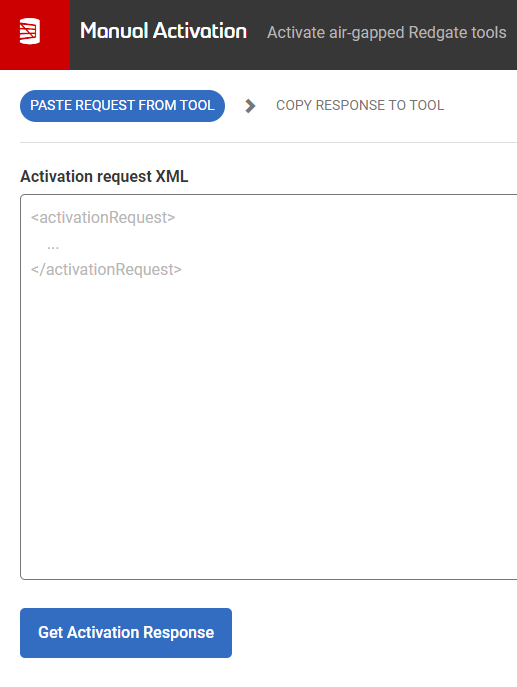 - Navigate to https://manualactivation.red-gate.com/ (This needs to be carried out from a machine that DOES have access to the internet, for example from your laptop) and paste the XML from the previous step