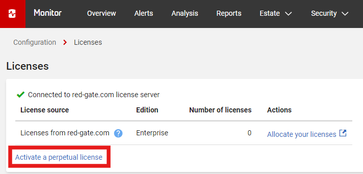 - Visit Configuration/Licenses in the Redgate Monitor Web UI