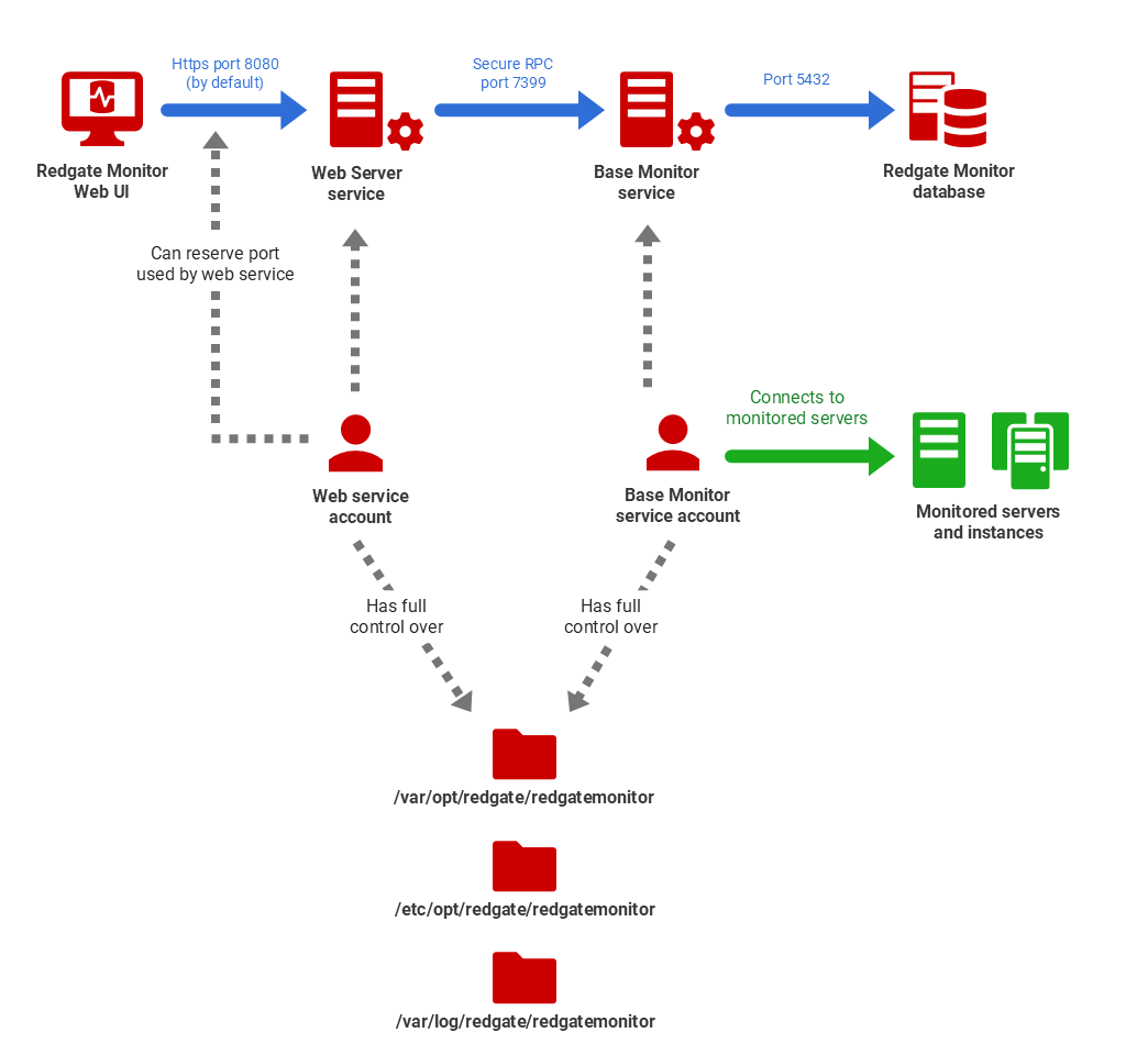 The Service account details are established initially as part of the Redgate Monitor installation process, but you can change the account used to run either service as described below. The following sections summarize the permissions each service account requires. For an understanding of why they need these permissions, see How Redgate Monitor works.