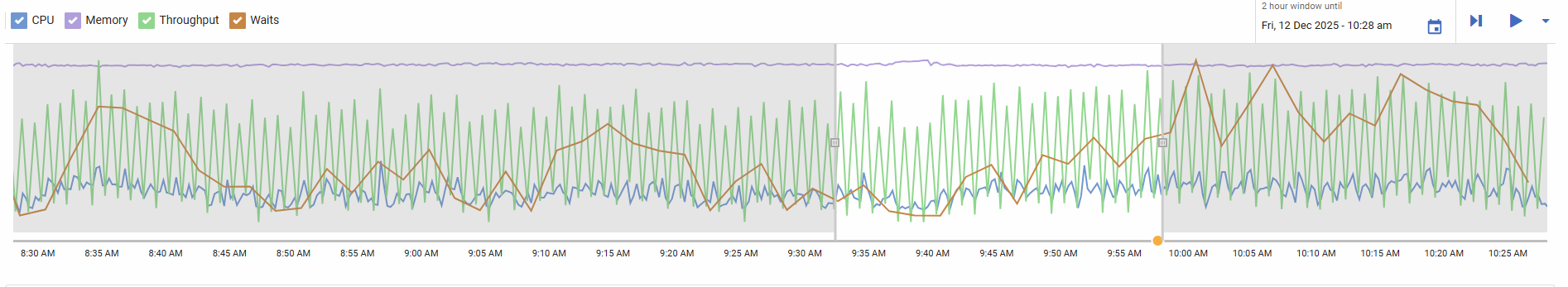 This time-window is bounded to be between fifteen minutes and two hours and by default will end at the current time. The end time can be altered using the date picker. The time window can be narrowed by manually shrinking or growing the selector, which allows you to focus on specific times.