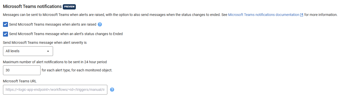 6. Copy the webhook URL you created, then paste it into the Microsoft Teams URL field under Teams notifications. This will enable you to receive notifications from Monitor whenever an alert is triggered.