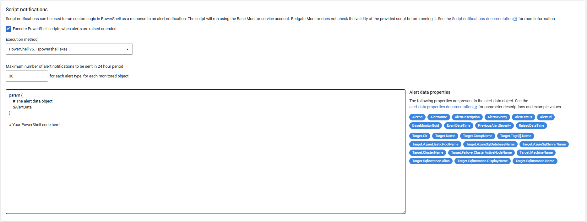 You can then write your PowerShell script inside the box. The parameter $AlertData will be available within the script, containing alert information.