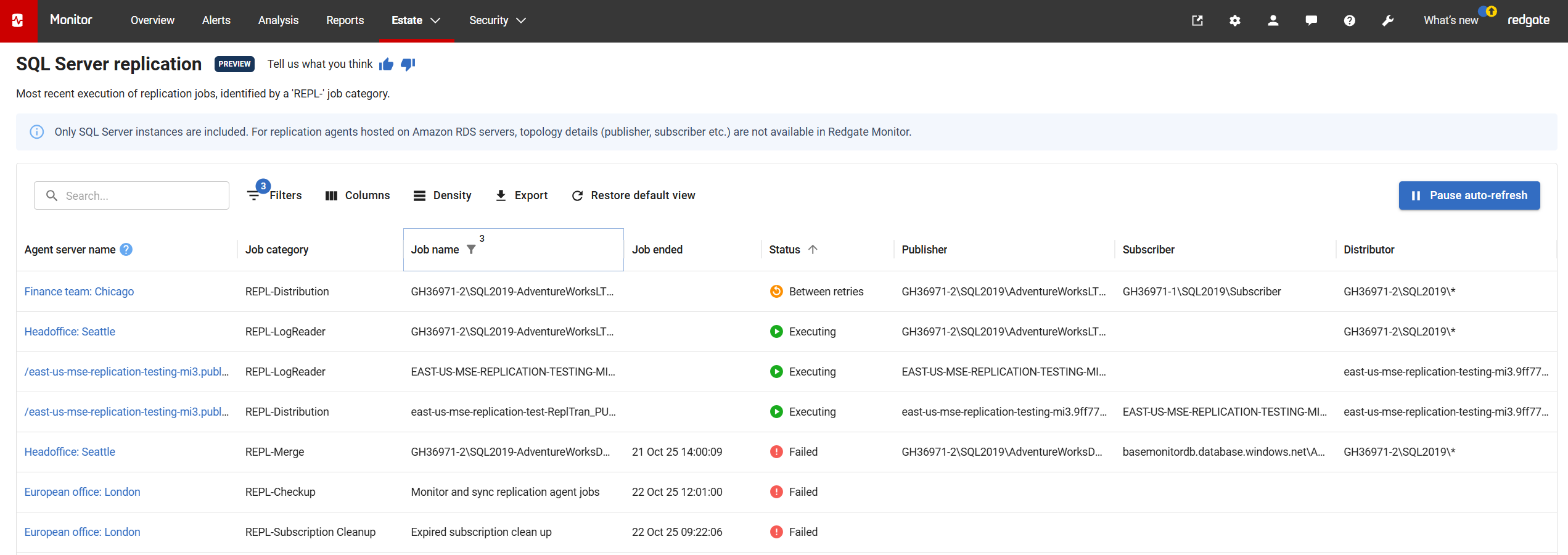 Redgate Monitor provides detailed visibility into the current state of replication-related Agent jobs. If your SQL Servers rely on snapshot replication, transactional replication, or merge replication processes to synchronize between databases, Redgate Monitor's Estate > SQL Server replication page provides a useful overview to check that these processes are running.