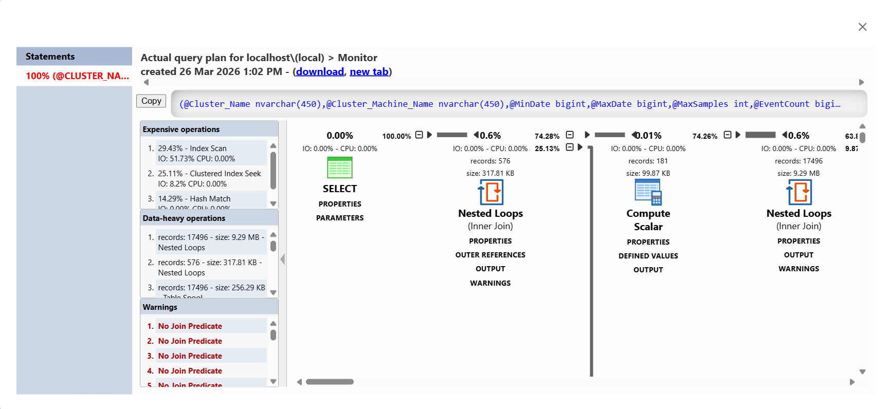 - The latest query plan handle and a button to show the full graphical query plan.