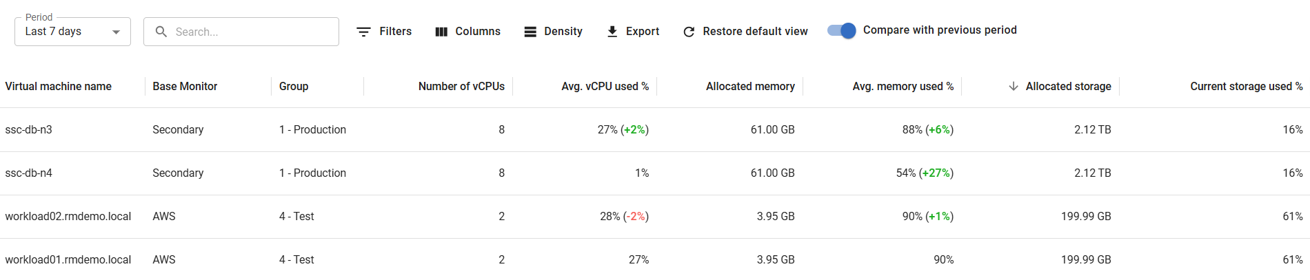 The Compare with previous period toggle compares the selected time period against an equivalent preceding period, displaying the difference for each virtual machine. For example, "Last 1 Month" compares the most recent 30 days against the previous 30 days. Your preference is saved and will be remembered when you return to this page.