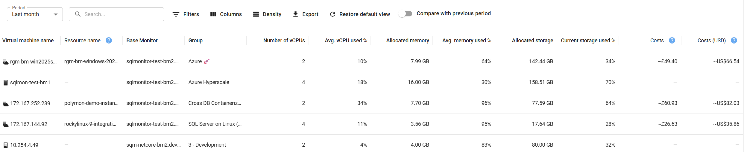 The Compare with previous period toggle compares the selected time period against an equivalent preceding period, displaying the difference for each virtual machine. For example, "Last 1 Month" compares the most recent 30 days against the previous 30 days. Your preference is saved and will be remembered when you return to this page. You can use the Period, Filters, Columns, and Density controls to customize the view and export data for further analysis.