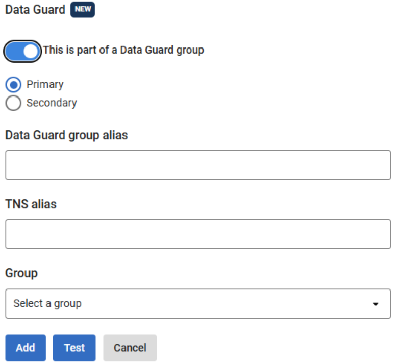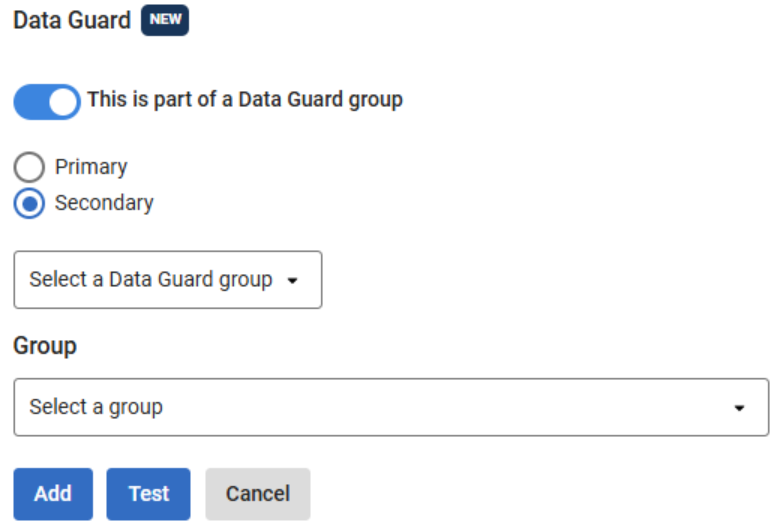 Use this procedure to register Oracle instances that are part of Data Guard, either as a Primary creating a new group or as a Secondary joining an existing group.