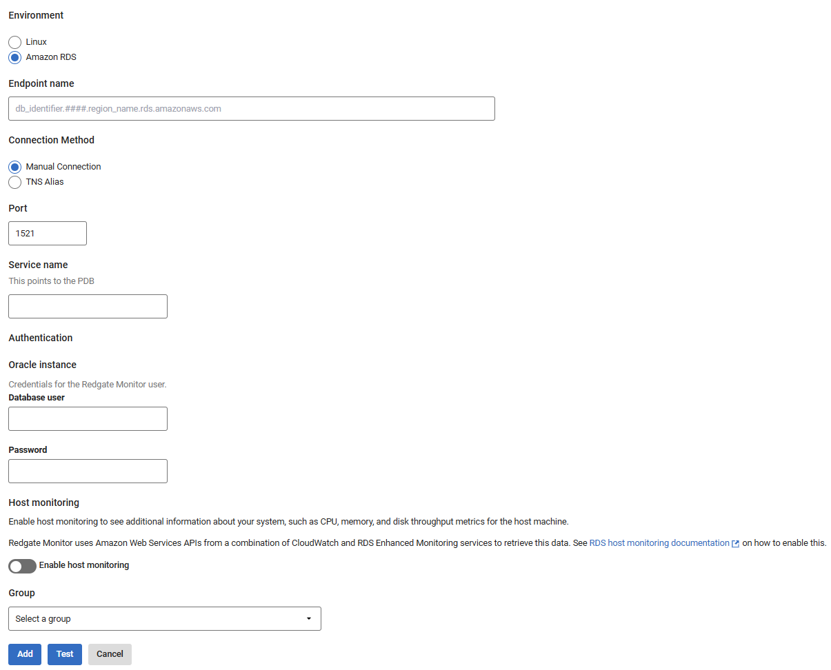 Make sure you have read Preparing Oracle for monitoring before adding an Oracle instance to Redgate Monitor.