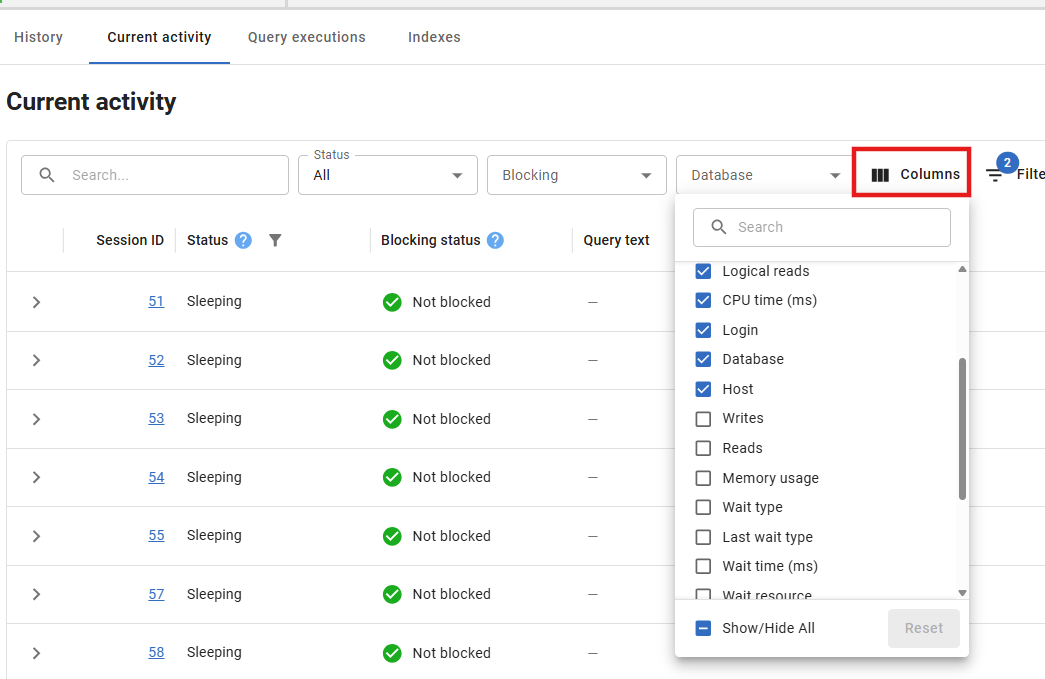 - Use quick dropdowns to filter by status, blocking, or database.