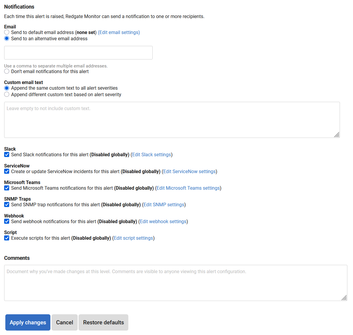 This section describes how to configure the built-in Redgate Monitor alert settings. See: Custom metrics and alerts for details of creating and configuring those.