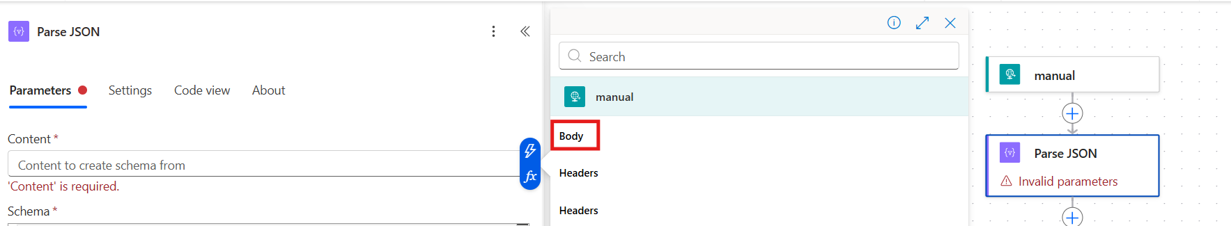 In the configuration pane for the Parse JSON action, for the Content parameter, type / to access Insert dynamic content > Body. This allows the action to use the body portion of the JSON we receive from the previous action (in our example, a trigger called 'manual').
