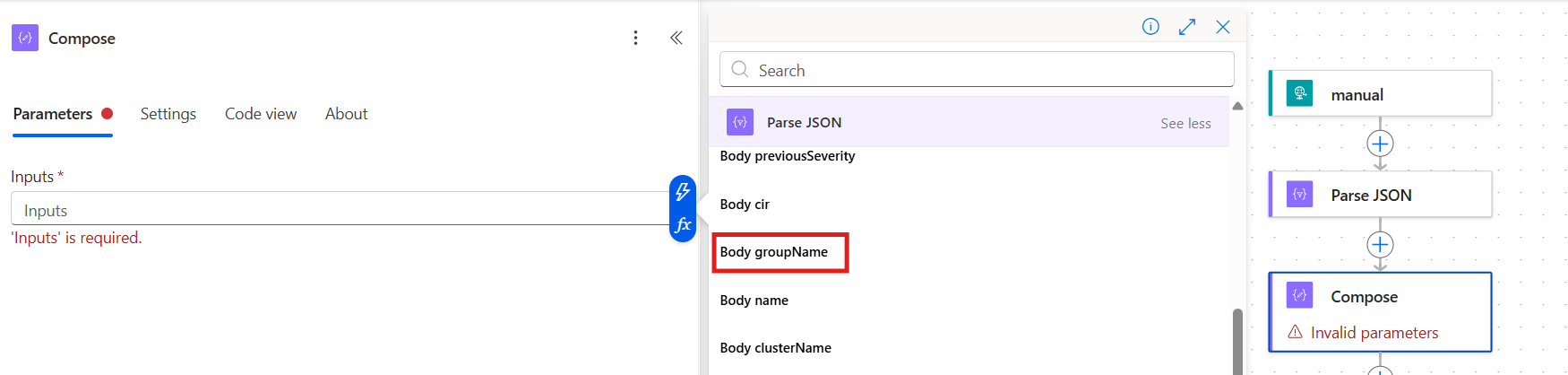 In the configuration pane for the Compose action, for the Input parameter, type / to access Insert dynamic content > Body groupName. This allows the action to extract just the groupName property from the previous action (Parse JSON).