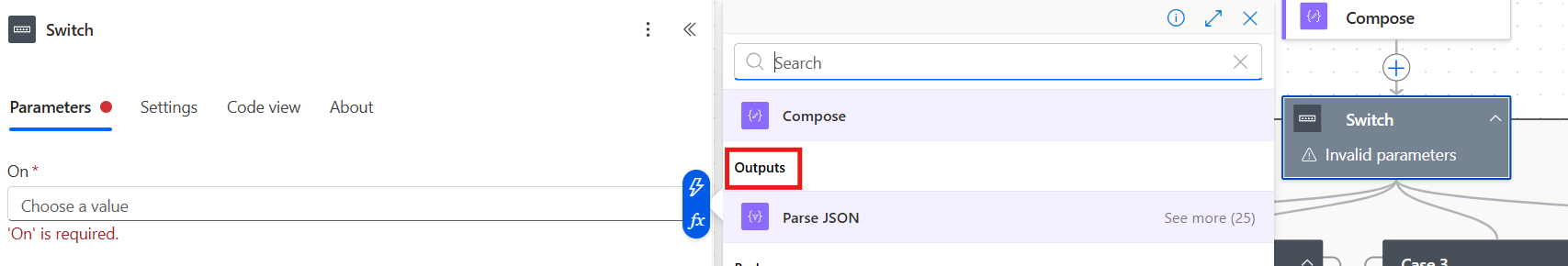 In the configuration pane for the Switch action, for the On parameter, type / to access Insert dynamic content > Outputs. This allows the action to switch subsequent flow paths, depending on the output of the previous action (Compose).