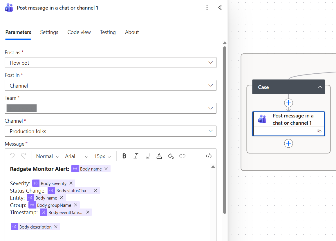 - Configure Redgate Monitor to send webhook messages to this Power Automate workflow