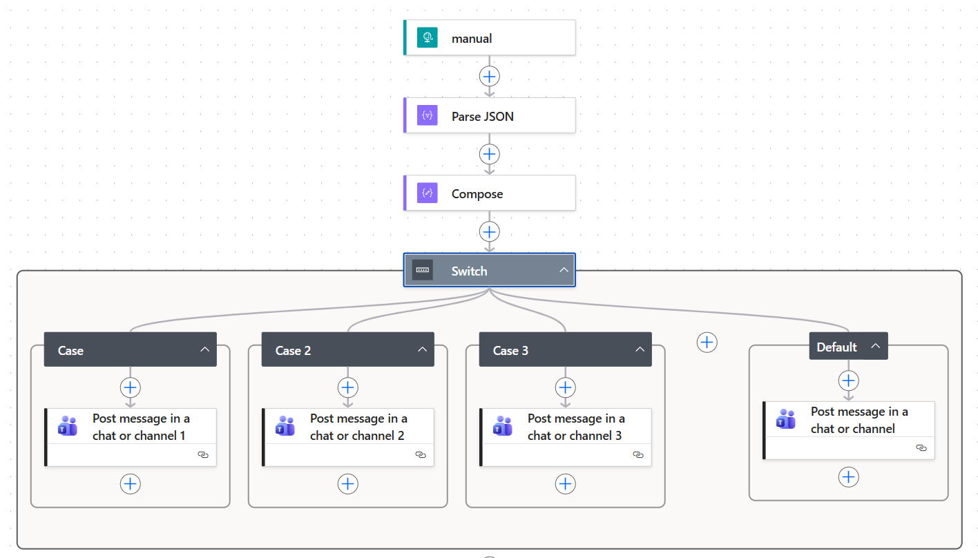 In the workflow, add an action after the Parse and Compose steps. Select the action type Control → Switch.