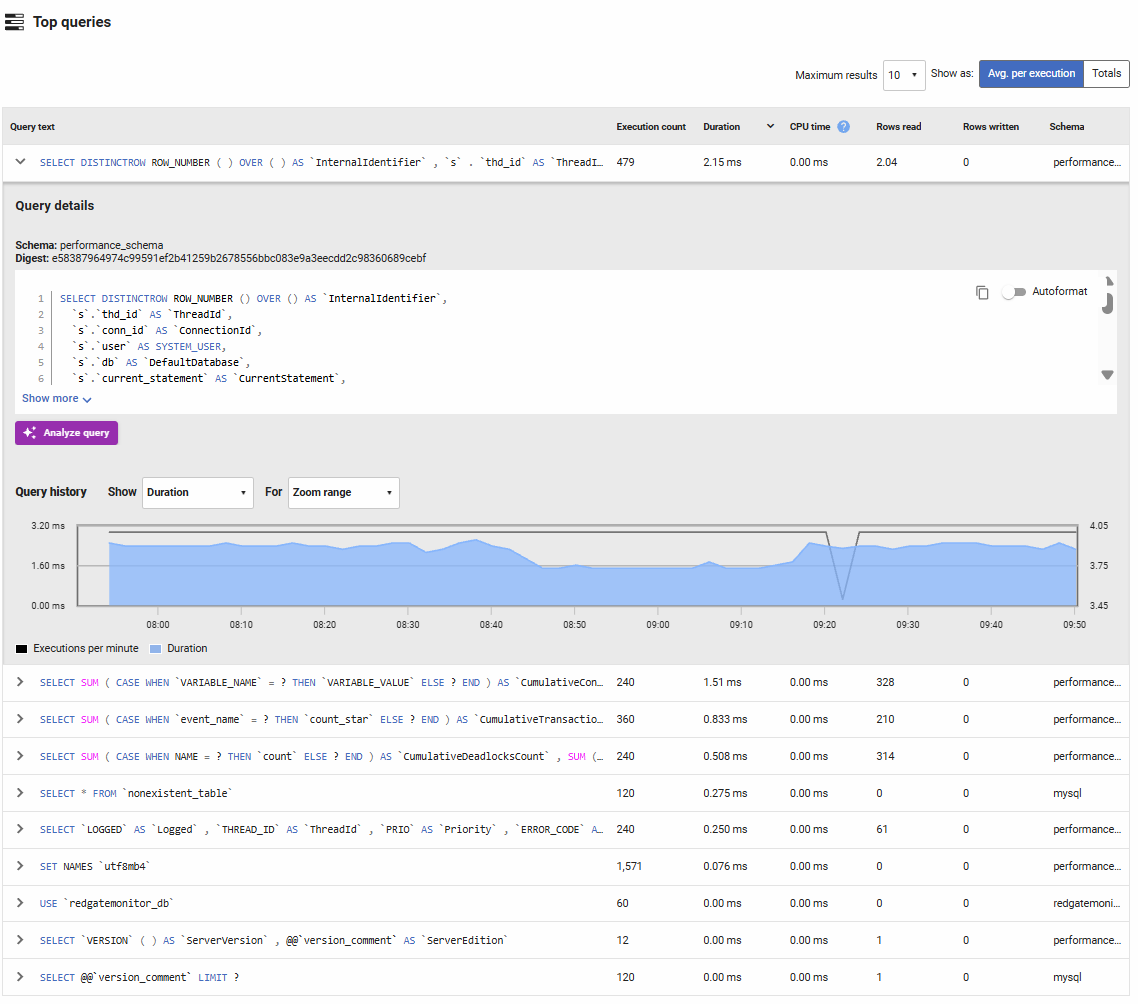 Compare rows read to rows returned—if a query reads millions of rows but returns only a few, it likely needs better indexing. High execution counts with moderate duration suggest candidates for caching or query result optimization. Queries with high CPU time may benefit from rewriting to reduce computation or use more efficient operations. Expanding a query reveals detailed metrics and execution history over time to guide your optimization efforts. The Analyze query button provides an AI assistant to review the query and suggest improvements, click here to view the documentation