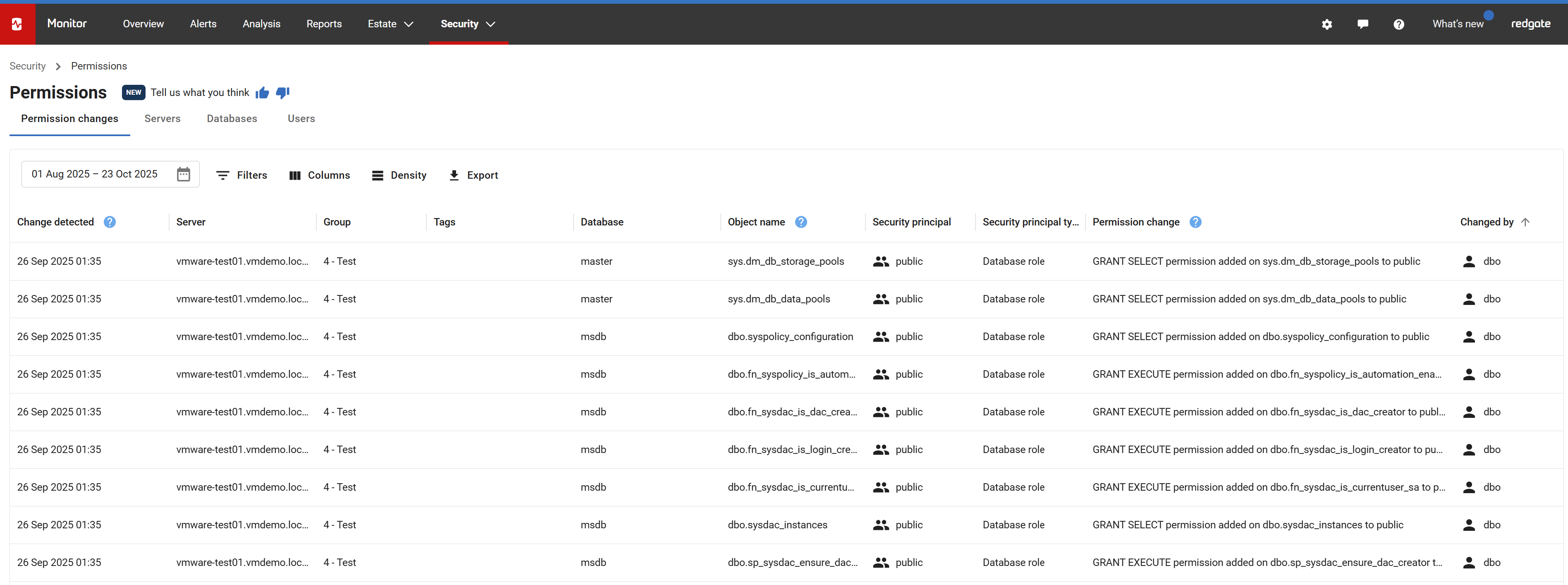 This tab will display permission changes that are made on all servers and databases for a selected date range. The permission changes that Redgate Monitor detects and doesn't detect are detailed below.