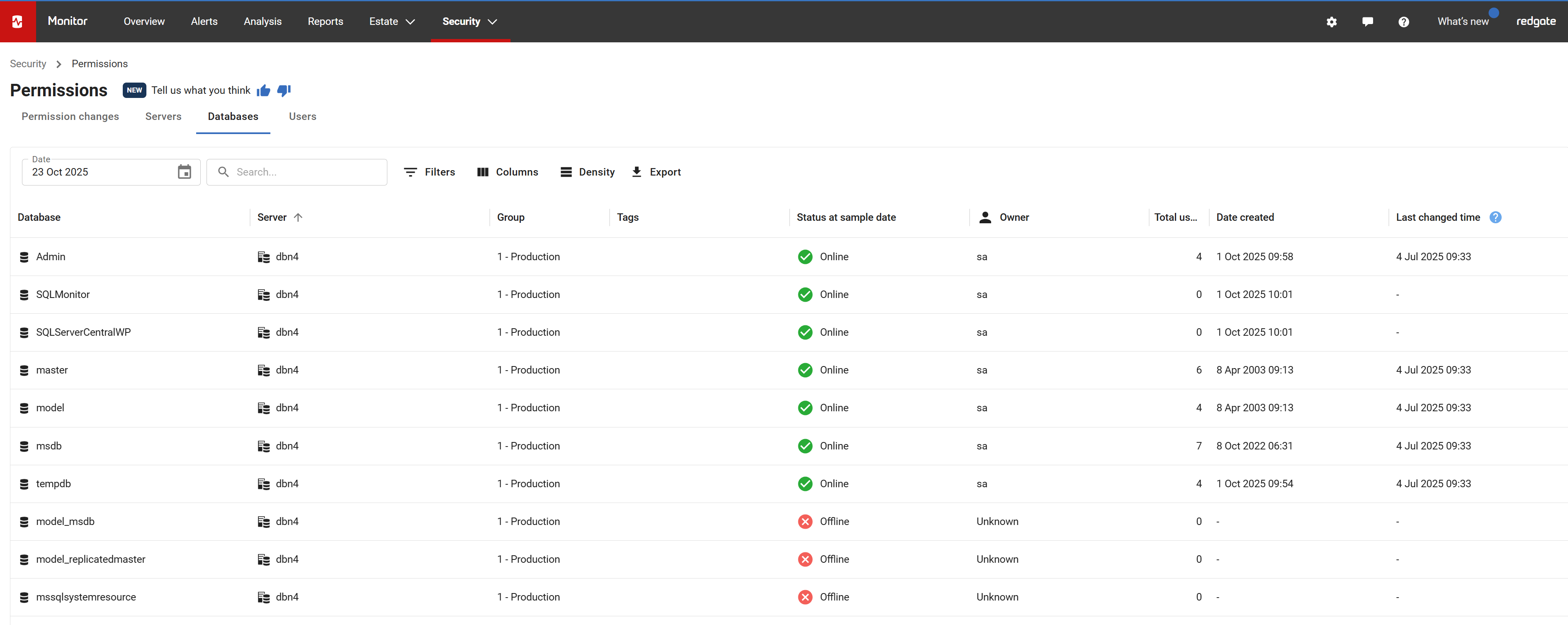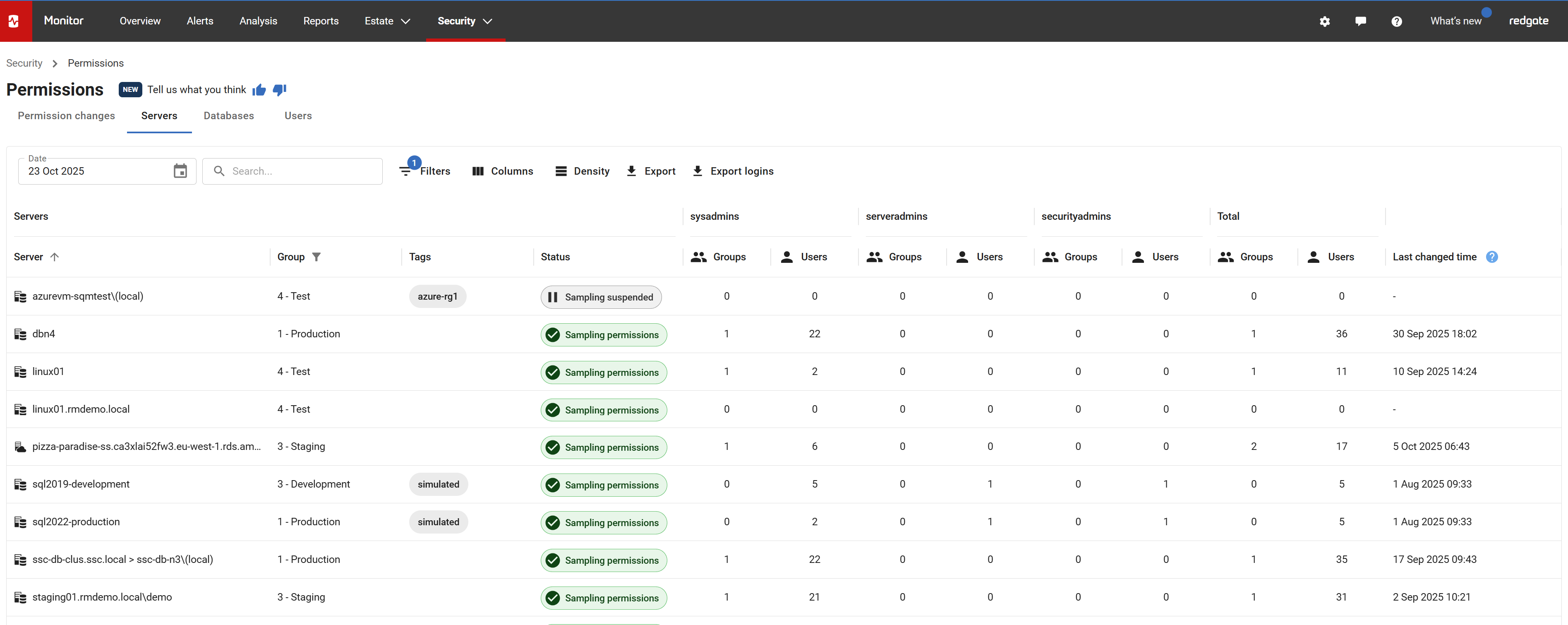 - Status: Indicates if Redgate Monitor is sampling the permission data for the specific server.