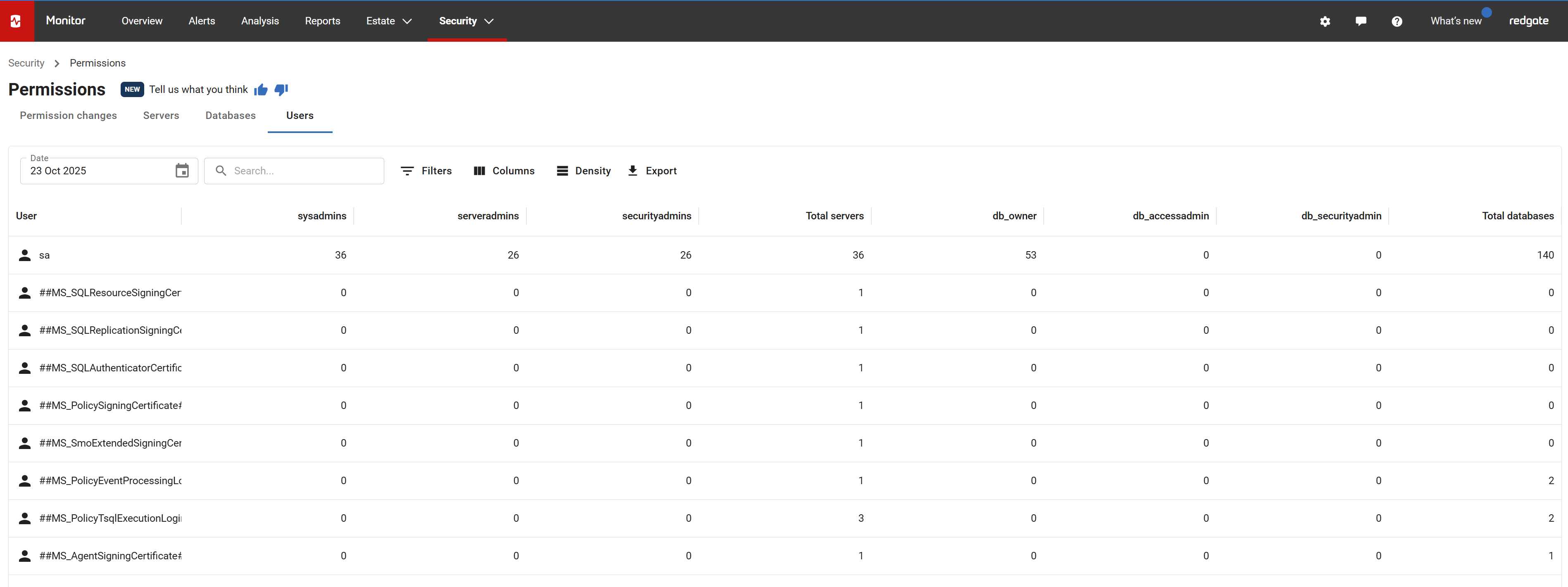 The permissions page in Redgate Monitor Enterprise allows DBAs to view user access rights in their database environments. It displays comprehensive information about each user's access privileges and allows DBAs to easily identify users with access to sensitive information.