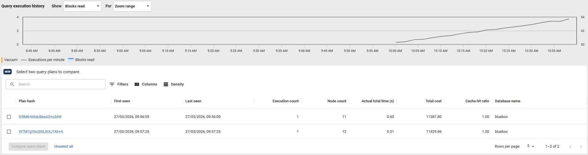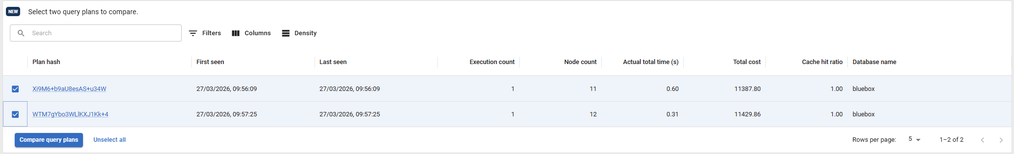 The actual query plan table can be used to compare exactly two query plans together. This is possible by clicking on any two rows in the Actual query plan table to select them. Once selected, the 'Compare query plans' button is enabled and can be clicked to open a new window to compare those query plans.