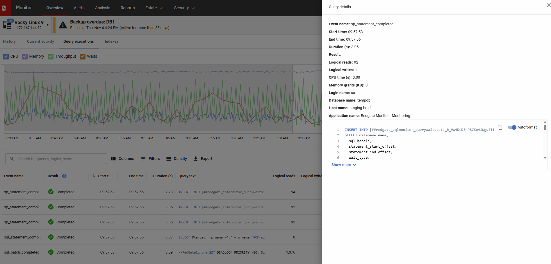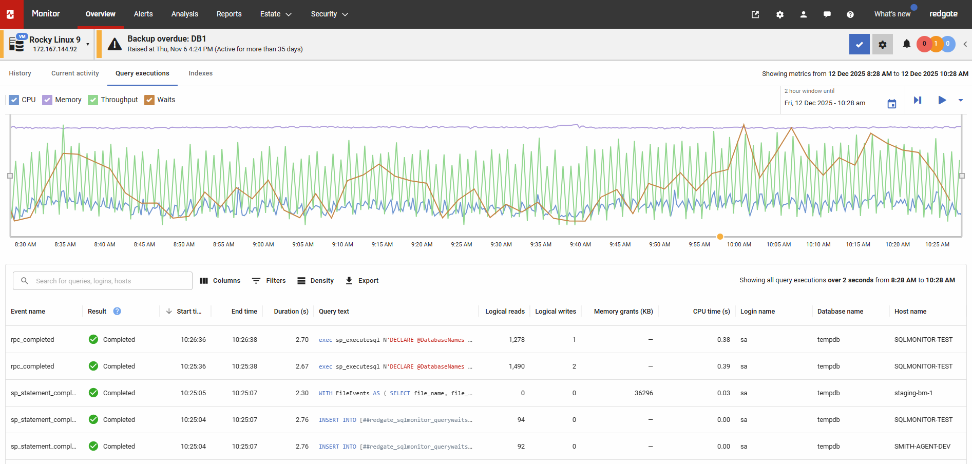 The tab contains a copy of the history tab's activity graph allowing you to compare spikes in CPU, memory usage, throughput and waits with the long running queries that were executing at that time.