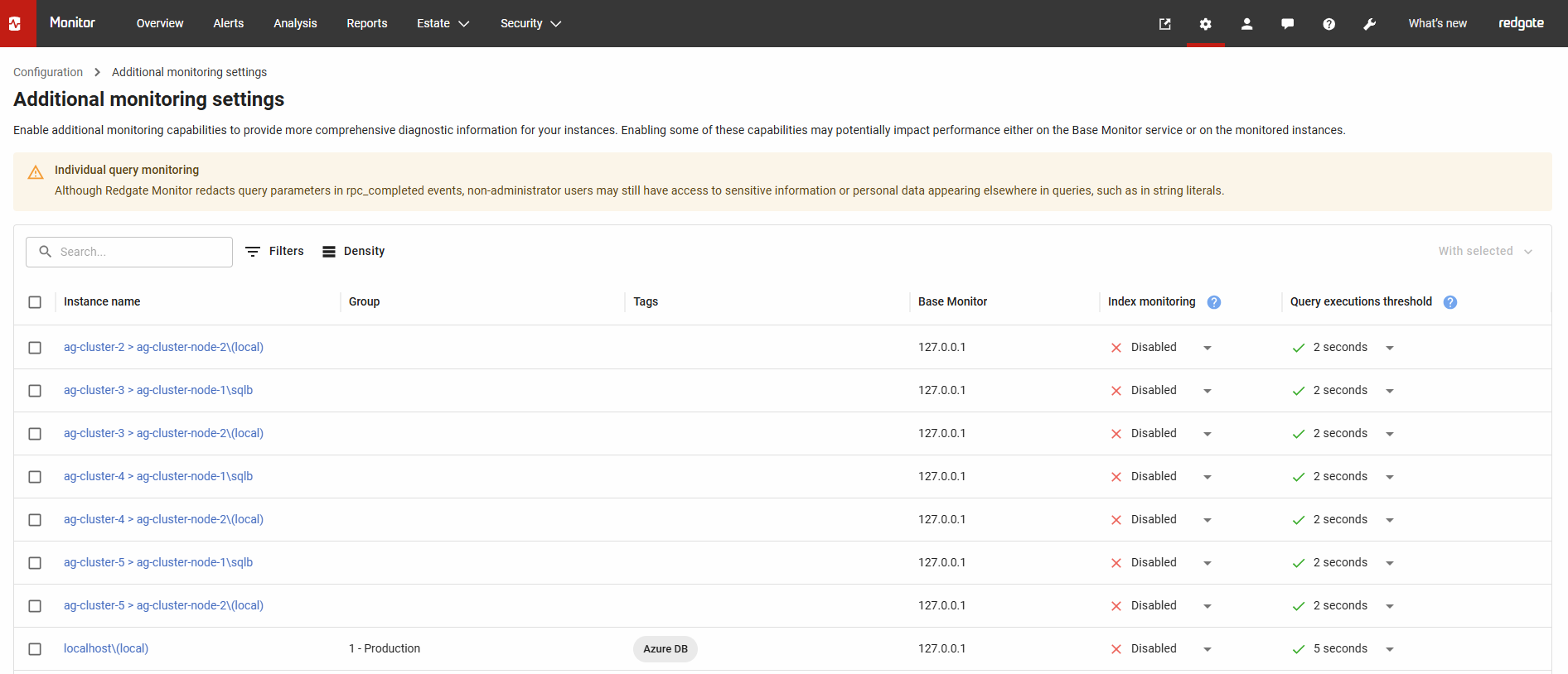 Query execution monitoring is disabled by default on all monitored instances; it can be enabled for specific instances using the Additional monitoring settings page located in Configuration > Advanced.