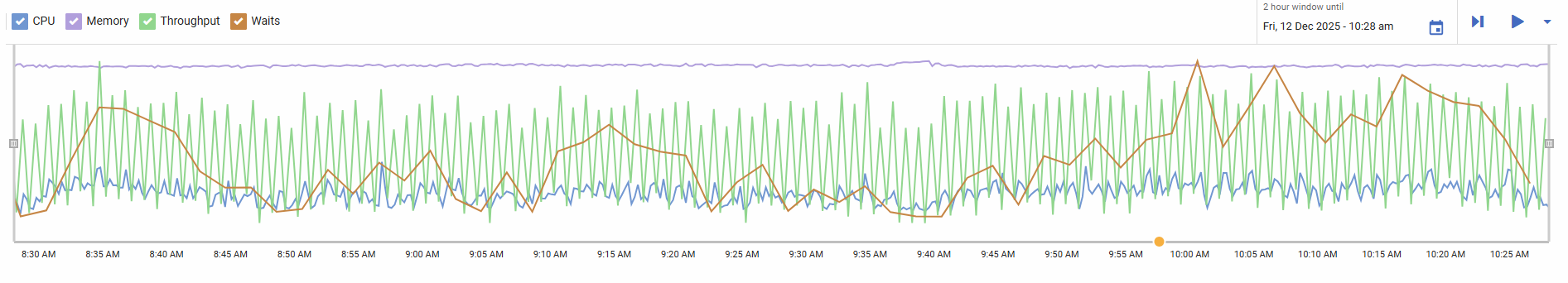 The activity graph shows CPU and memory usage, as well as throughput and the amount of time spent on waits. Like on the history tab, the graph contains controls for changing the time-window the page represents.